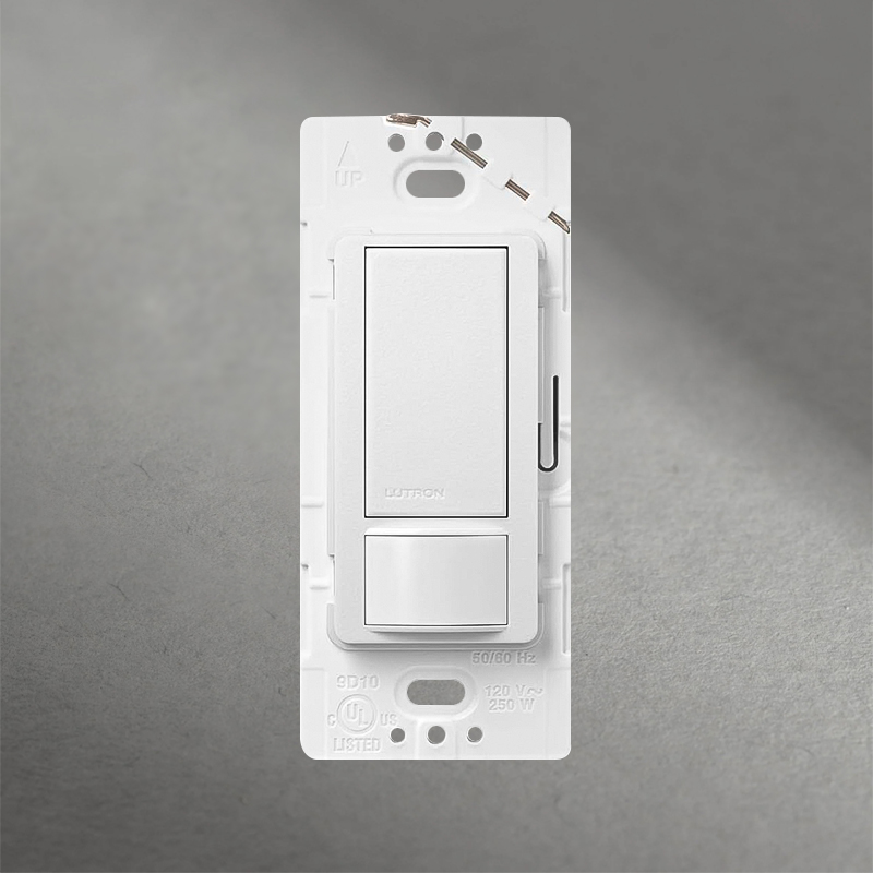 El interruptor sensor Maestro de Lutron combina un interruptor con un sensor de ocupación/vacancia de tecnología infrarroja pasiva (PIR). Detecta el calor emitido por las personas en movimiento dentro del área de cobertura (hasta 180°), lo que permite encender o apagar automáticamente la carga conectada, optimizando la eficiencia energética y comodidad.