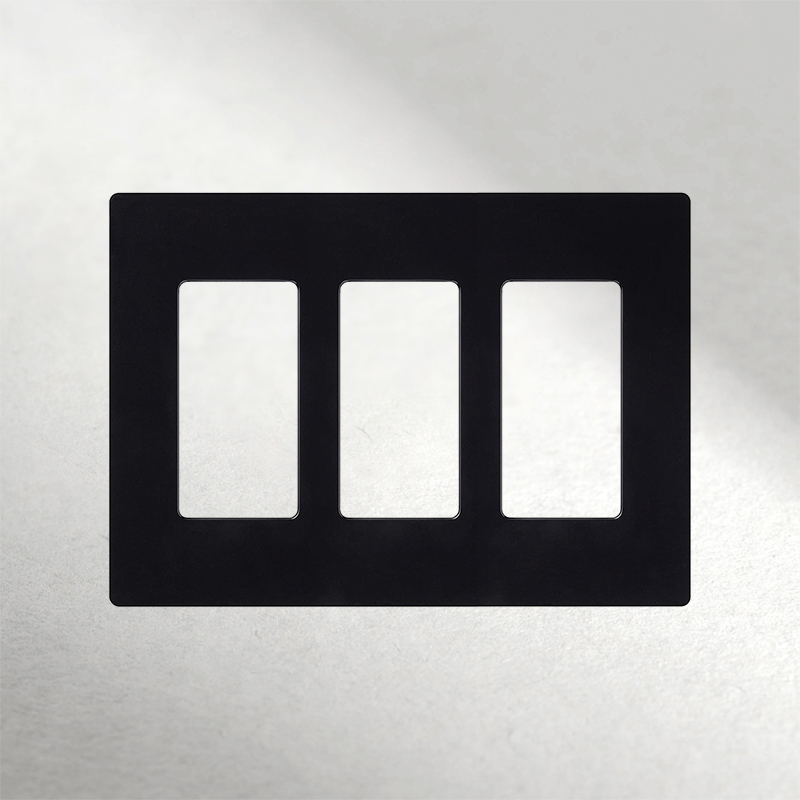 Placa para tres dispositivos Lutron de diseño elegante, fabricada en plástico brillante negro, ideal para complementar cualquier espacio con un toque moderno y funcional. Perfecta para interruptores y controles, brindando un acabado limpio y sofisticado.